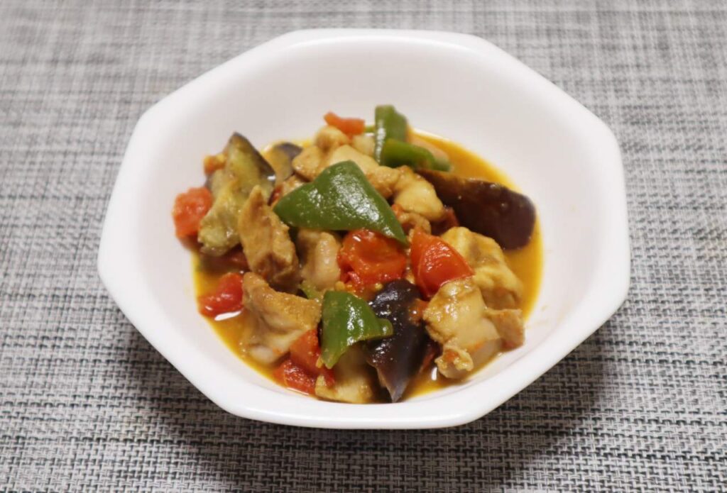 鶏もも肉にスパイス類がしっかりしみていて、トマトとピーマンとナスの夏野菜類にもエスニックなカレー風味も加わってご飯との相性もよく美味しく仕上がりました。