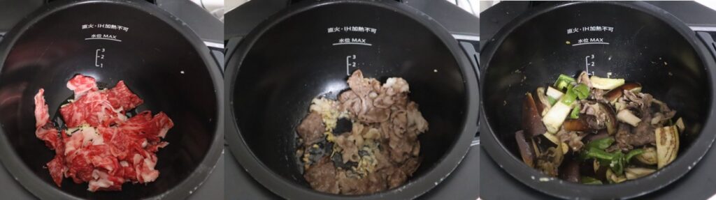ホットクックで作る、牛肉とナスとピーマンとエリンギの味噌炒めを紹介しました。