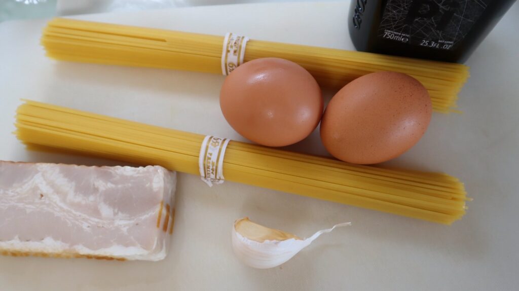 こちらが、ニンニクを炒めて、続いてベーコンを炒め、卵とパスタを混ぜたところです。