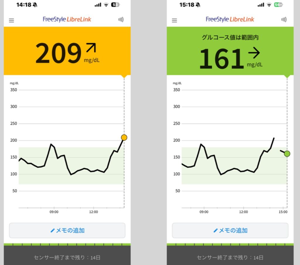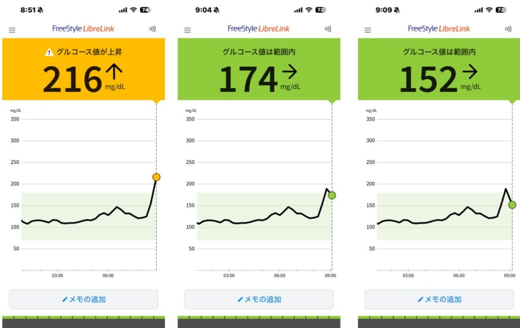 朝食後、血糖値が上昇し、設定された範囲を超えました。