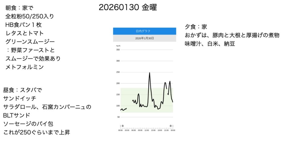 スタバの割とヘルシーそうなサンドイッチでも250ぐらいに急上昇しています。一方で、夕食はおかずは自炊、白米を一膳食べましたが、200ちょっと程度までで比較的抑えれています。