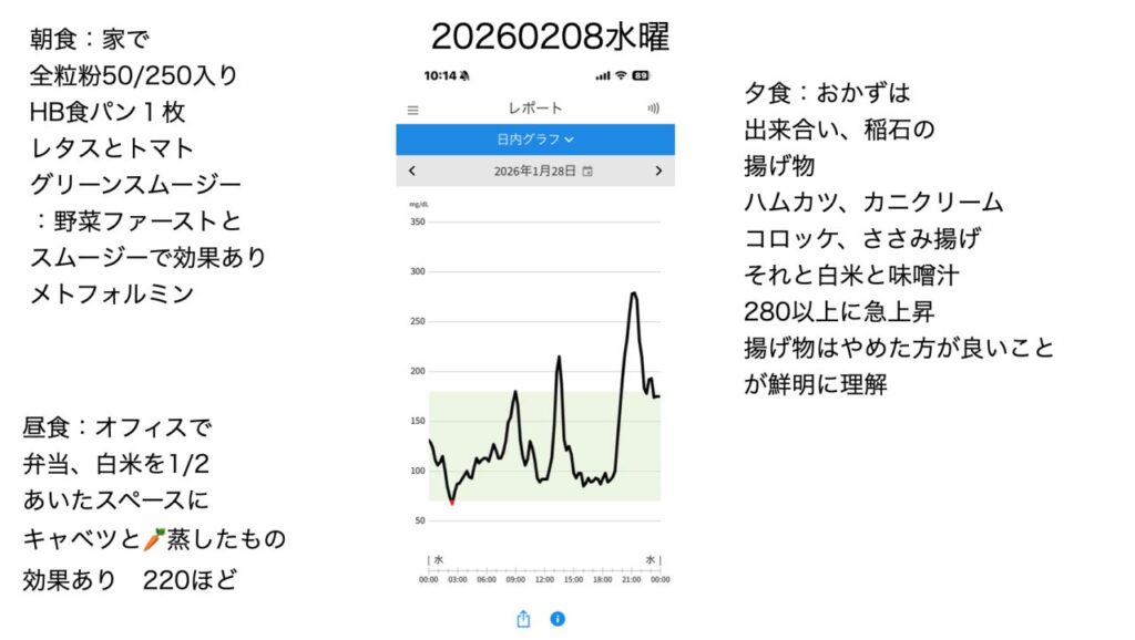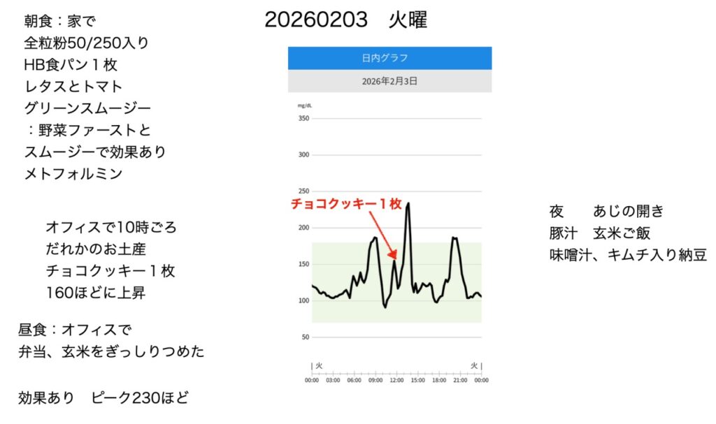 血糖値のピークは220程度に下がりました。