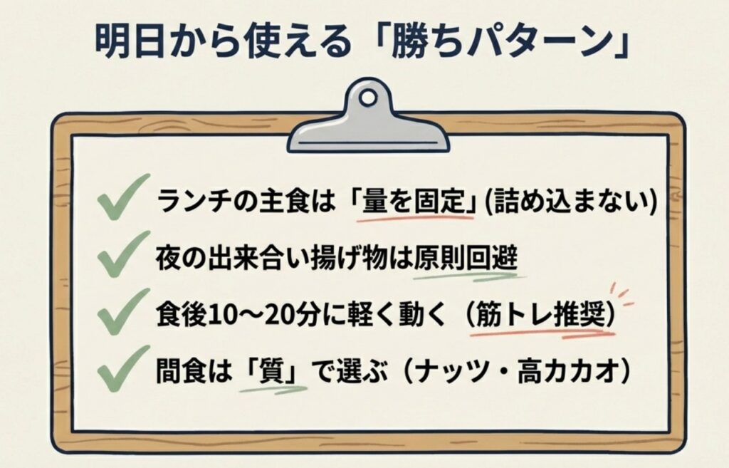 | 食後の筋トレ | 上昇が抑えられる |