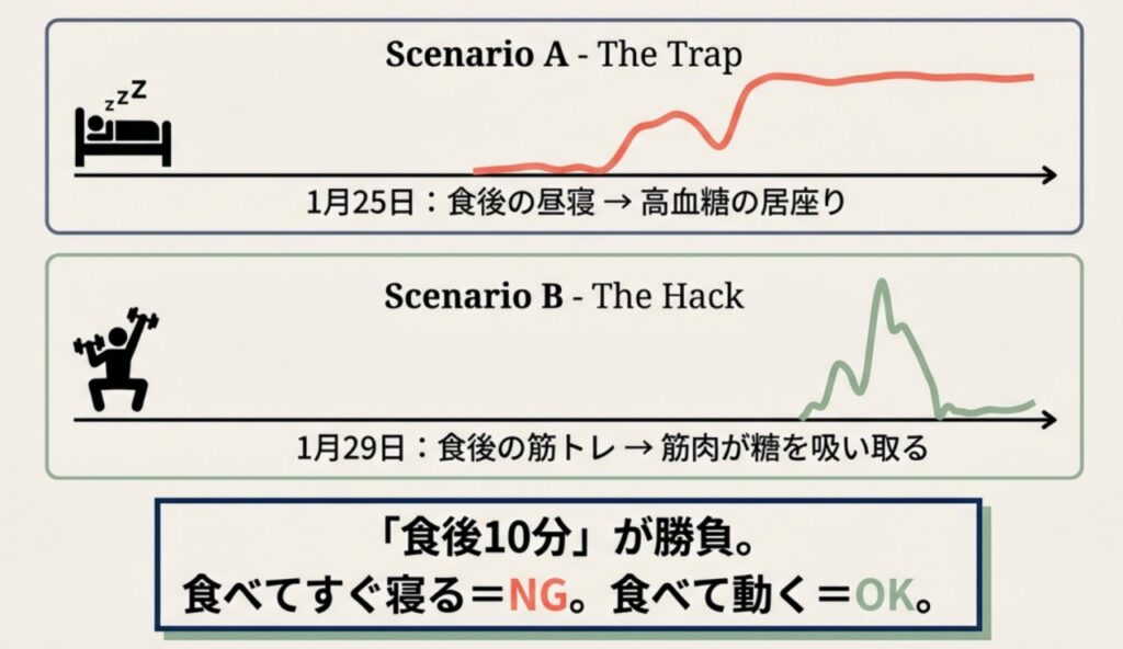 食後に筋トレを行った日は、