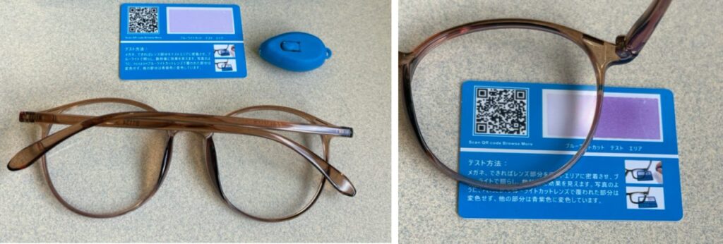 カードの上からメガネを左に置いてブルーライトを当てると、右の写真のようにメガネのレンズ越しの場合はテストカードの色が変色しないことが確認できました。