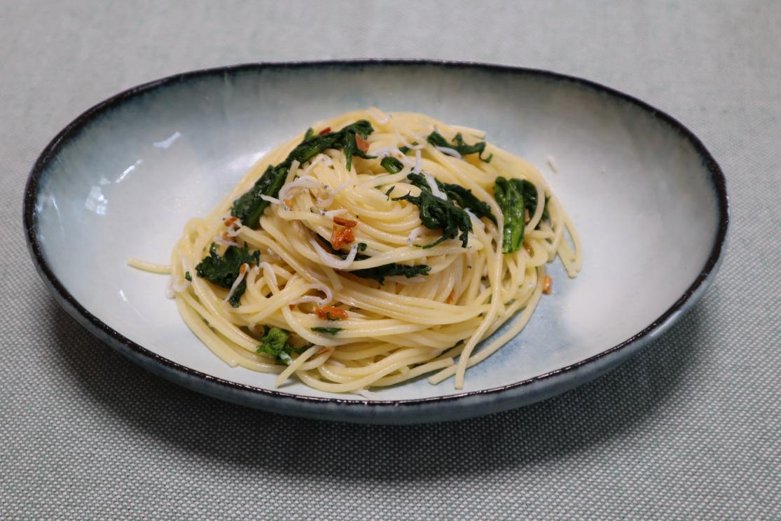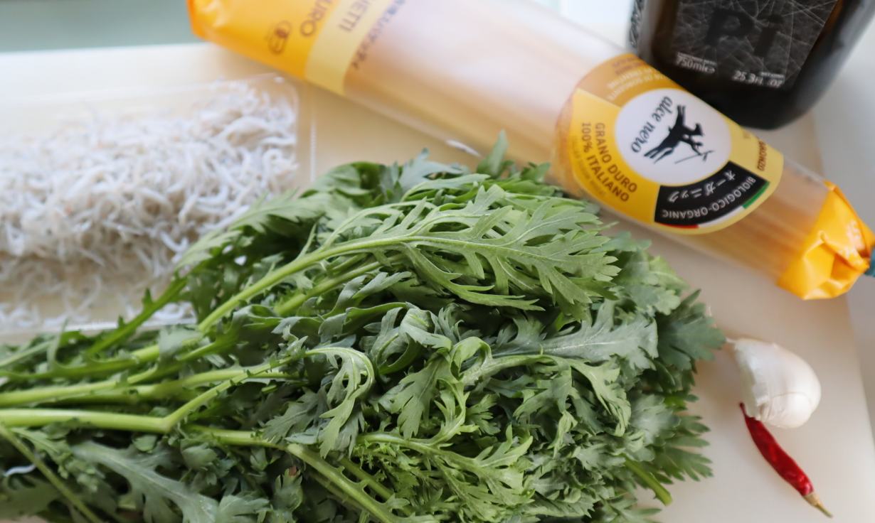 春菊とシラスを使ったペペロンチーノを作りました。美味しくできるのでオススメです。