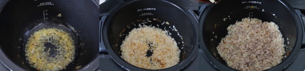 こちらが、玉ねぎに続いて米を炒め、さらにひき肉を加えて炒めたところです。