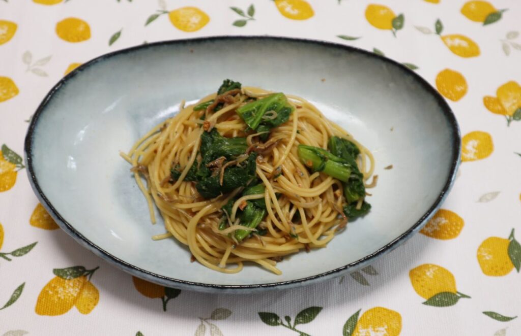 今回はちりめんじゃことわさび菜を使った和風ガーリックパスタのレシピを紹介します。