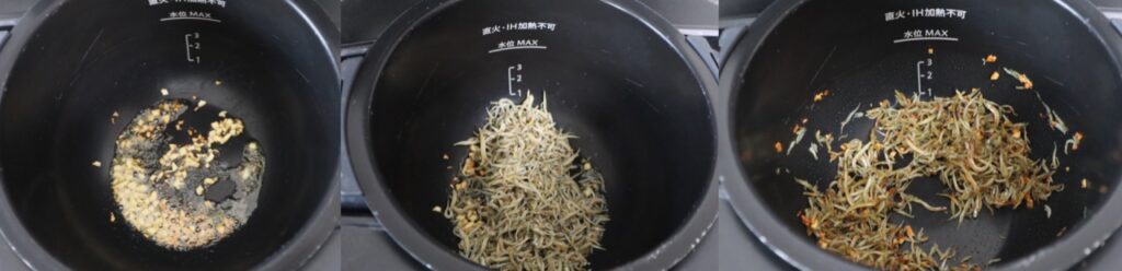 ・その後、ちりめんじゃこと醤油を内鍋に加えて