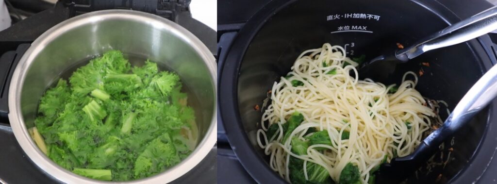 ・別の鍋でパスタを茹でる。その時に茹で時間の2分前にわさび菜を加える。